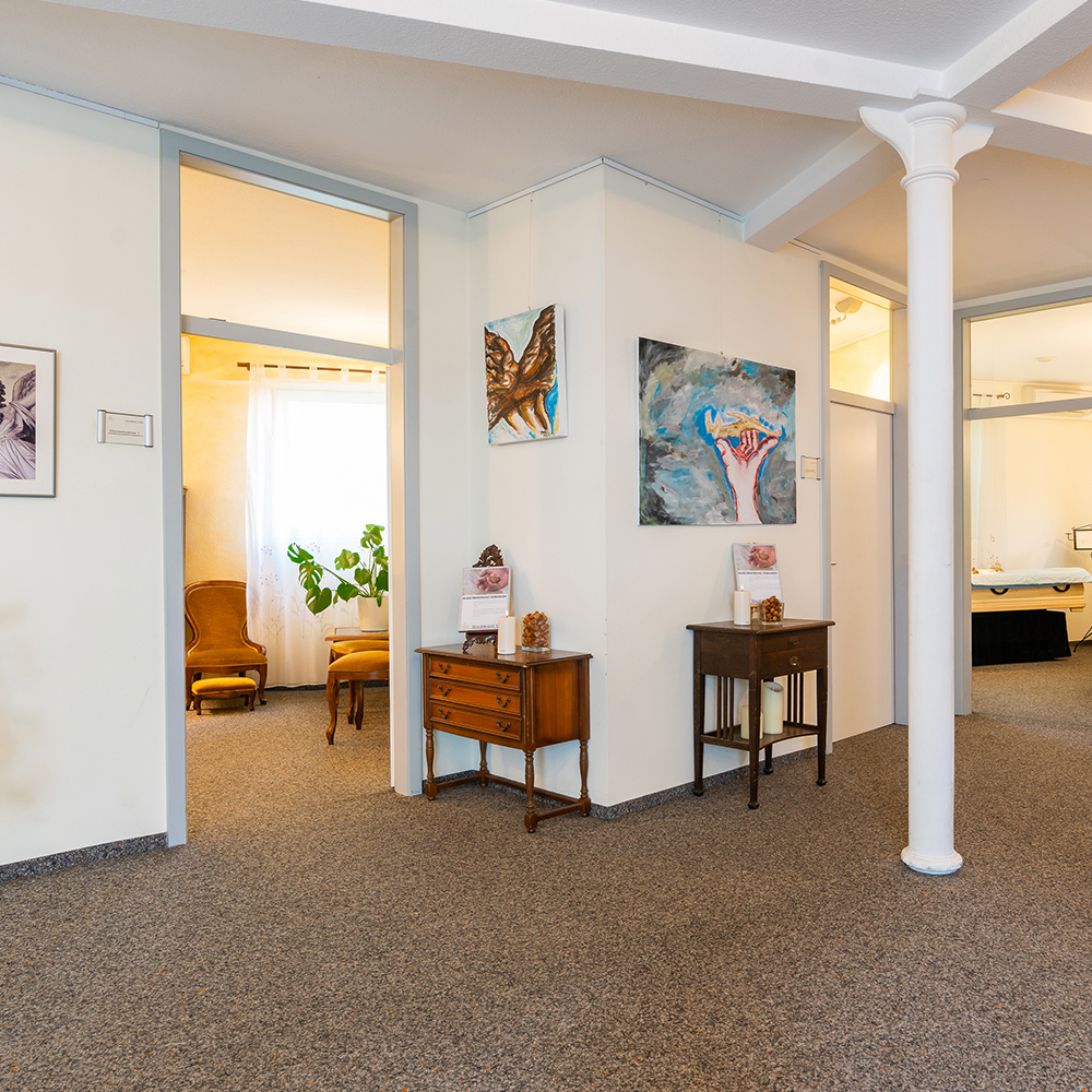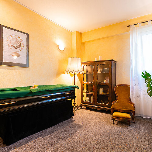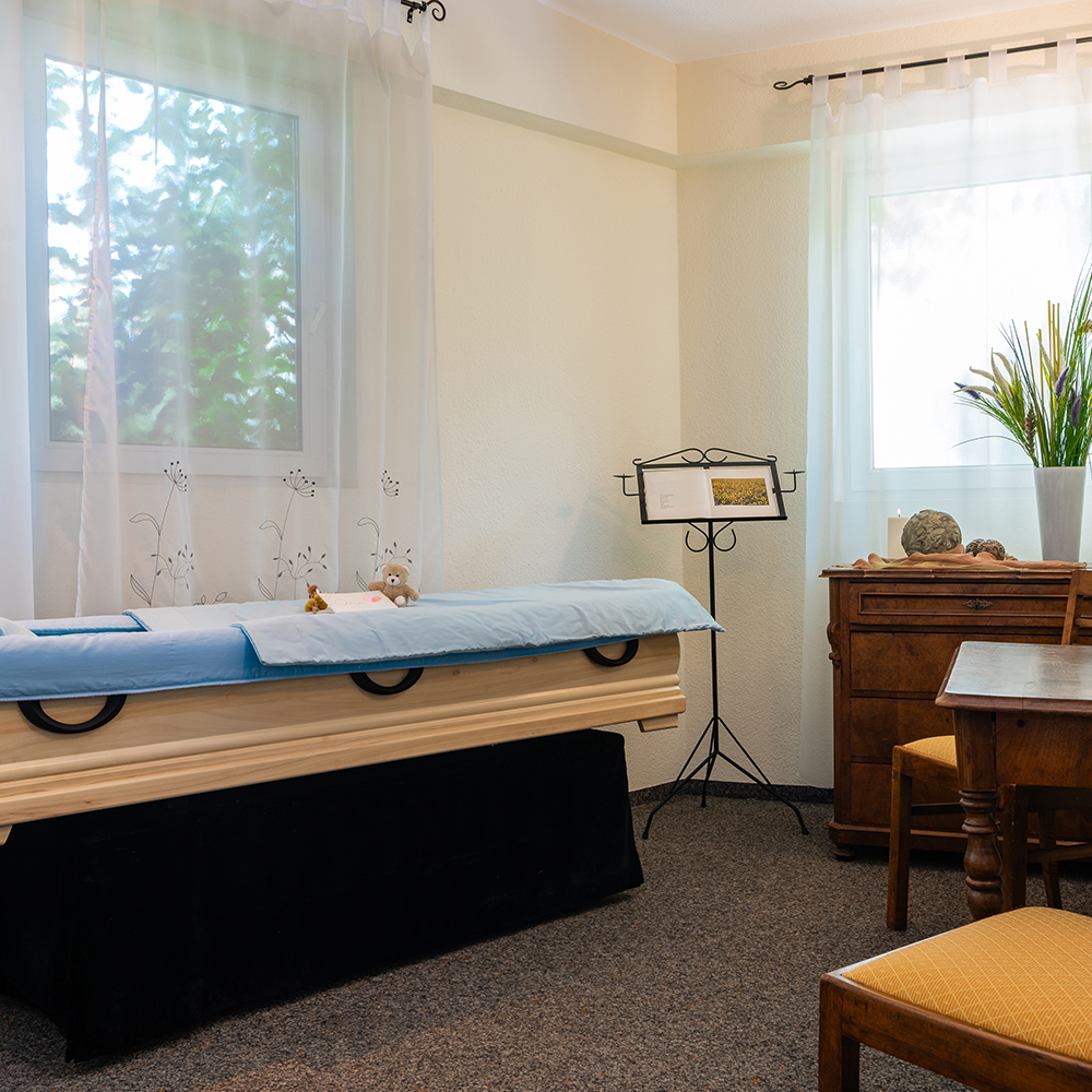 - In unseren Abschiedsräumen können Sie bewusst letzte Momente mit dem Verstorbenen verbringen – unabhängig von unseren Bürozeiten.