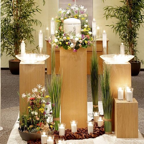 Mit unserer hauseigenen Trauerhalle bieten wir Ihnen einen neutral gestalteten Rahmen für klassische Trauerfeiern oder einfache, selbst gewählte Andachten. Da wir eine aktive Auseinandersetzung mit dem Abschied für richtig und wichtig halten, unterstützen wir Sie bei der Umsetzung Ihrer Ideen unabhängig von Religion, Kultur oder anderen gesellschaftlichen Vorgaben. Musik, Texte, Dekoration sowie der Ablauf der Trauerfeier – alles können Sie frei wählen. Für die musikalische Begleitung der Trauerfeier stehen eine Orgel und ein Klavier bereit – spielen Sie gerne selbst darauf oder wir bestellen Ihnen einen professionellen Organisten bzw. Pianisten.